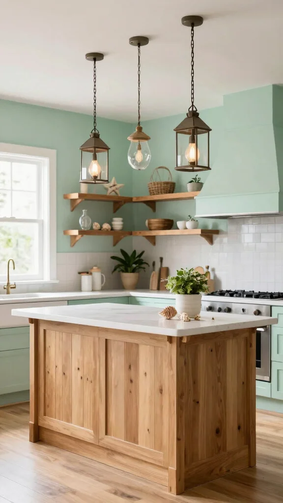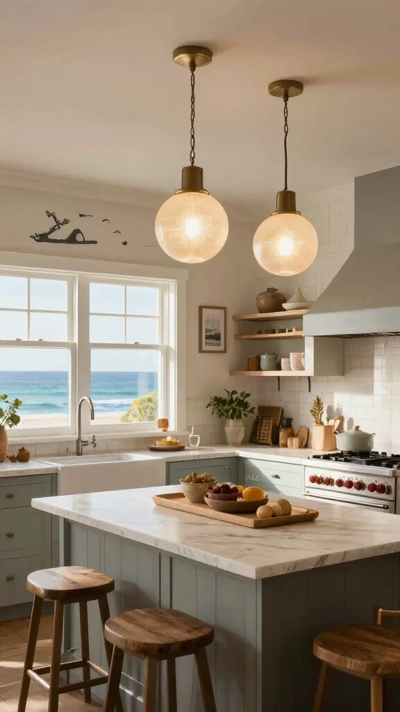 Hanging them individually or in groups creates a stunning display above an island or breakfast nook. The soft illumination they provide fosters a calm and relaxed atmosphere, perfect for a coastal kitchen. To elevate the theme, incorporate seashells in your decor, such as in centerpieces or wall art.