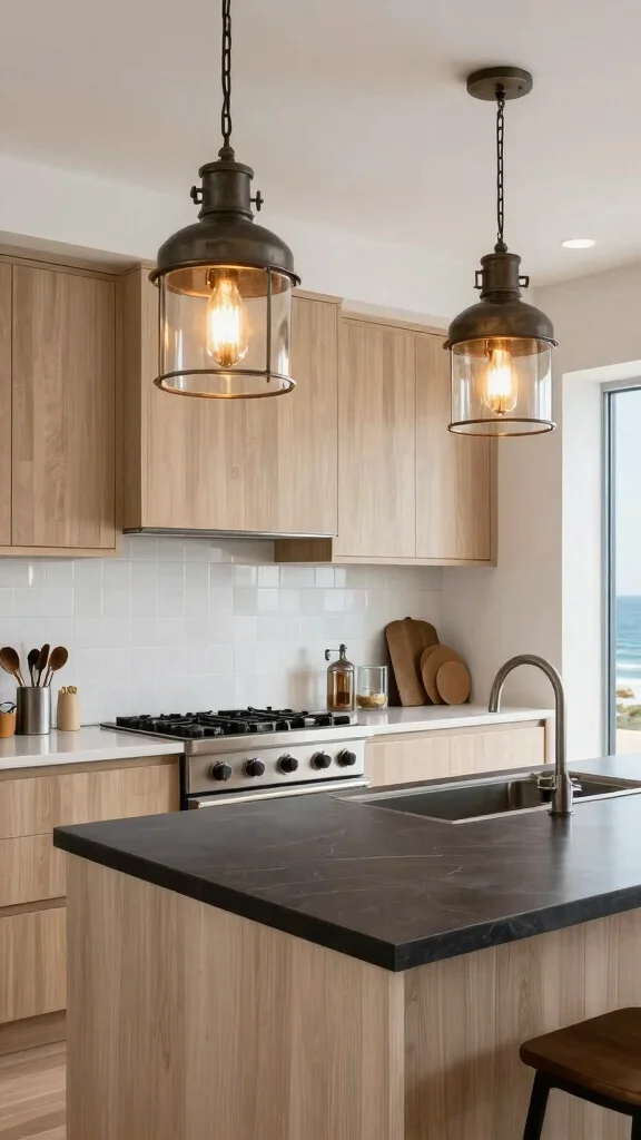 Begin with pendant lights that echo the sea. Choose coastal kitchen lighting fixtures that mix glass, rope, driftwood, or brass finishes to create texture.
