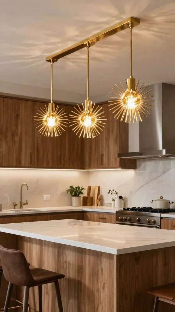 For an island, hang two to three pendants at evenly spaced intervals and adjust the drop to suit your ceiling height. Pair these with subtle under-cabinet lighting to keep countertops bright and functional.