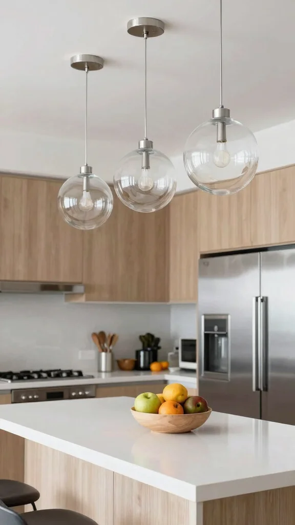 If you’re seeking a modern touch for your coastal kitchen, glass bubble pendants are an excellent choice. These fixtures feature clear glass globes that create a light, airy feel, making them ideal for smaller kitchens where you want to avoid overwhelming the space.