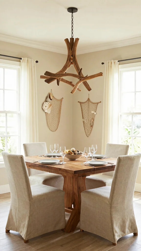 Incorporating a driftwood chandelier captures the essence of seaside living while maintaining an air of sophistication.