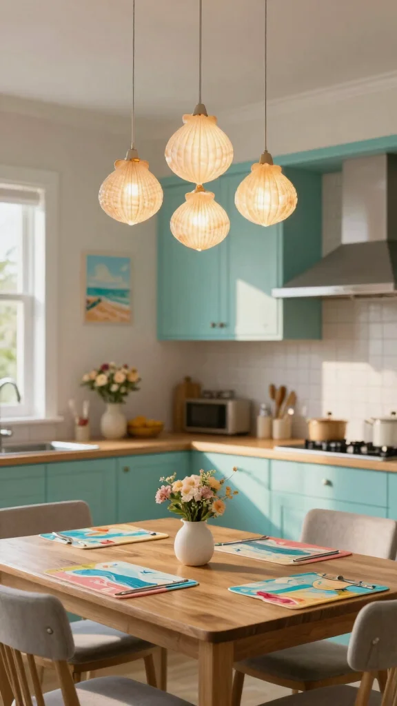 Embrace the essence of coastal living with shell and rope lights. These fixtures combine natural textures like jute rope with beautiful shell accents, adding a tactile, organic feel to your kitchen that embodies a beach-inspired theme.