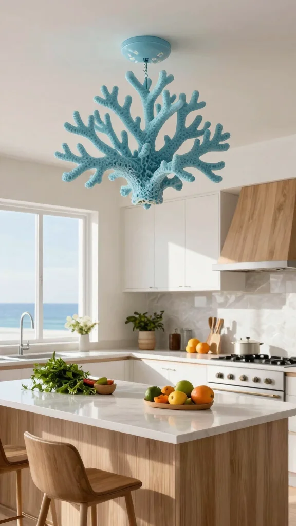 Transform your kitchen into an underwater wonderland with coral-inspired lighting. These fixtures mimic the shapes and textures of coral reefs, delivering a striking focal point in your space. Crafted from metal or resin and often finished in coastal colors like soft blues and whites, they add a playful elegance to your kitchen.