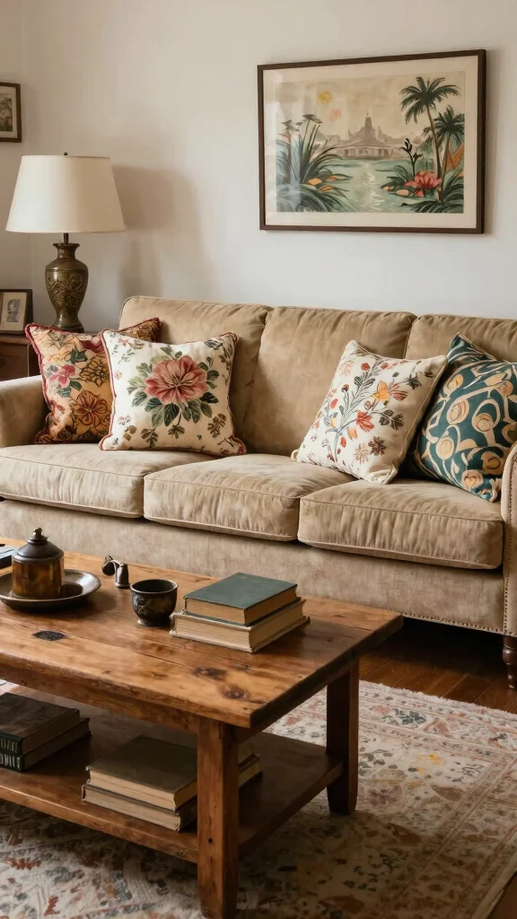 – Pair vintage pillows with more modern textures to keep the look fresh.
