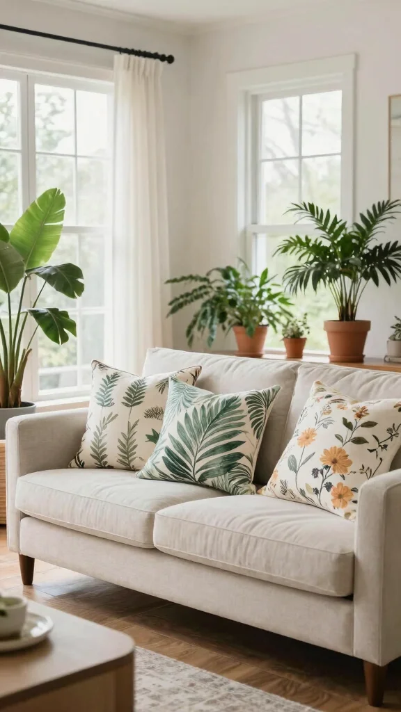 Nature-inspired prints bring a serene, calming vibe to your couch decor. Pillows showcasing floral designs, leafy motifs, or tranquil landscapes evoke the beauty of the outdoors, enhancing the inviting feel of your living area. These themes beautifully complement earthy tones and natural textures, creating a seamless blend of comfort and nature.