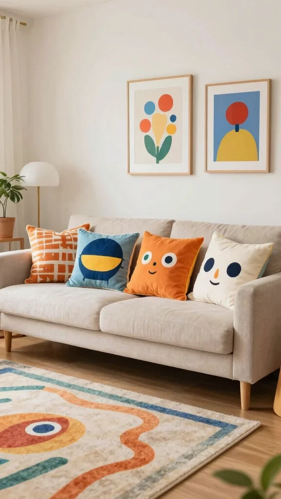 To balance the look, combine whimsical pillows with solid colors. You can find unique designs at local boutiques or online shops, ensuring your decor feels fresh and fun.