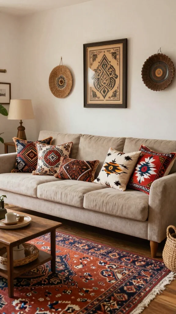To create a balanced look, select a few standout pillows and pair them with solid colors. You can find culturally-inspired pillows at artisan markets or online boutiques for a unique touch.
