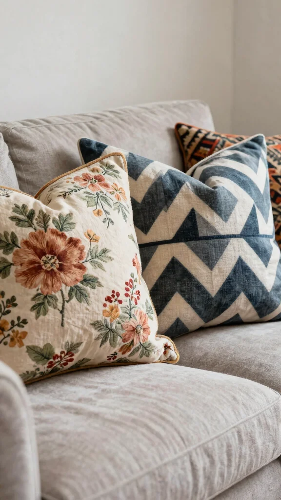 When incorporating patterns, aim for a cohesive color scheme to ensure harmony. You can find pillows at various price points, so explore local shops or online for unique designs. Layering different scales of patterns—like large florals with small polka dots—can enhance the visual interest of your couch setup.