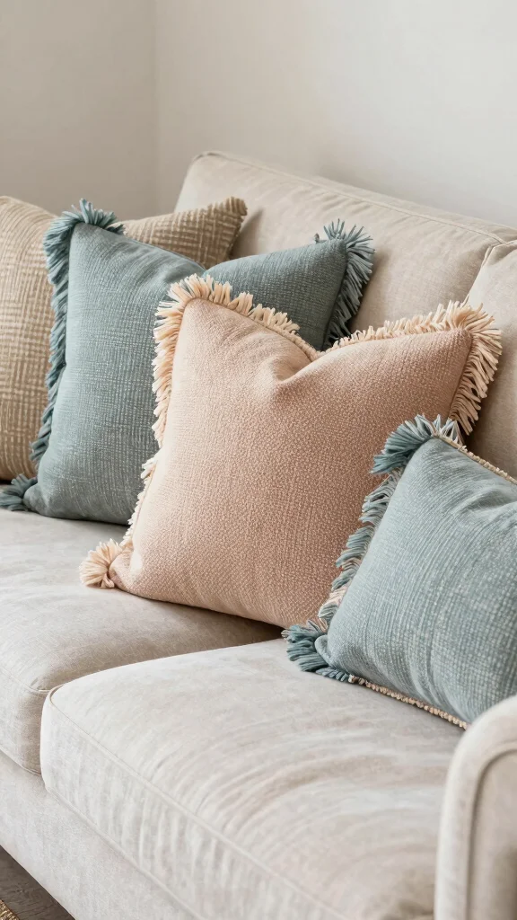 Incorporating fringe pillows brings a dynamic element to your couch, enhancing the cozy vibe. Explore local shops or online for budget-friendly options. Don’t hesitate to mix these with smoother pillows to create a well-rounded arrangement.