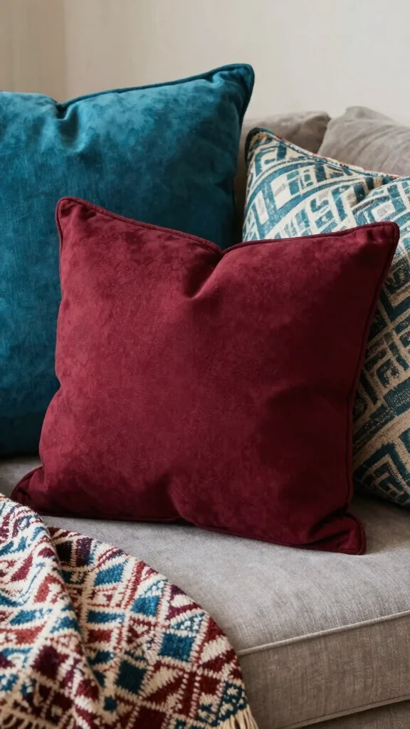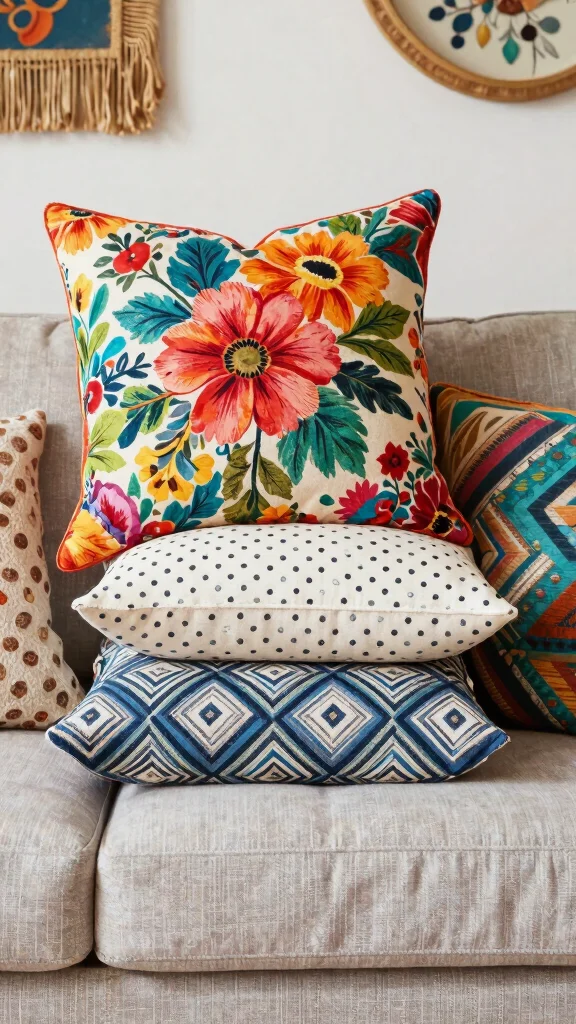 Mix textures like linen, velvet, crochet, and add a woven throw for warmth. Choose a cohesive color palette by repeating 2-3 tones across patterns, so the look stays intentional rather than chaotic.
