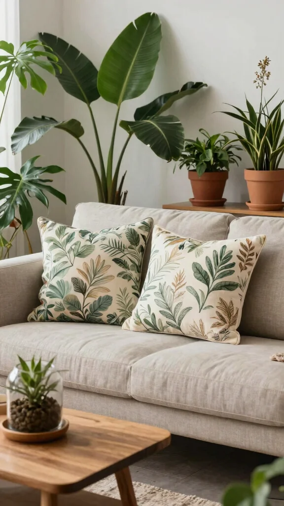 Natural elements bring a boho couch with throw pillows to life—soft textiles, leafy prints, and warm wood accents. Start with pillows in organic cotton or linen, add a few potted plants, and pick nature-inspired colors to tie the whole look together.