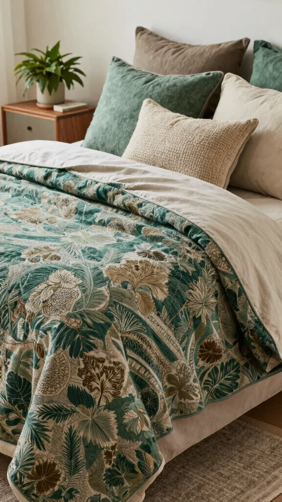 An artistic printed quilt featuring emerald green designs can bring your bedroom decor to life. These quilts often showcase stunning artwork that reflects your personal style while remaining eco-friendly, as many brands utilize sustainable materials and inks. Imagine how this vibrant quilt can serve as a focal point, inspiring the rest of your decor.
