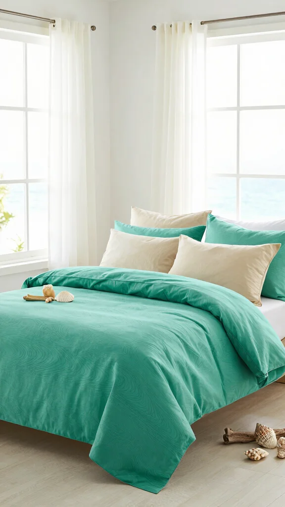 Coastal-inspired emerald bedding can infuse your bedroom with a fresh, breezy vibe reminiscent of serene ocean views. Incorporating elements like stripes or subtle wave patterns will enhance the coastal aesthetic while maintaining an eco-friendly focus. Picture how this bedding can create a tranquil environment, perfect for relaxation.