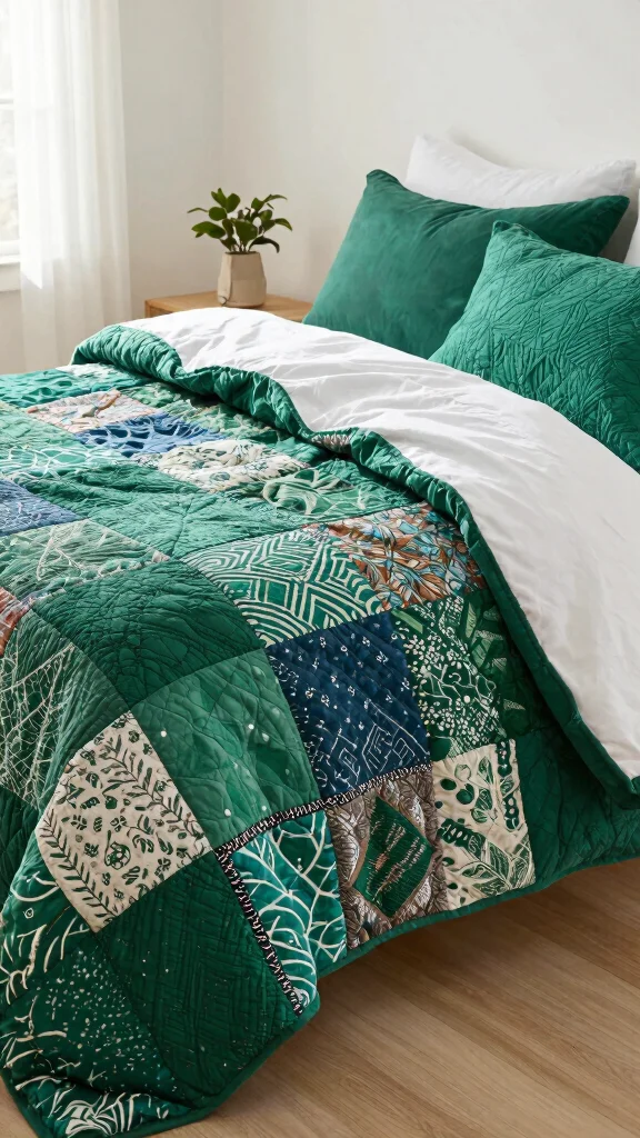Embracing patchwork quilts in emerald green can bring warmth and eco-conscious charm to your bedroom.
