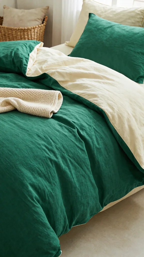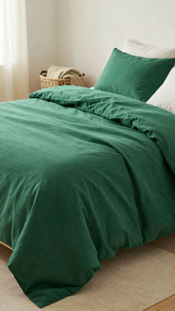 Linen sheets in a vibrant emerald hue are an excellent choice for those who appreciate the beauty of natural fabrics. Linen, derived from flax plants, is one of the most eco-friendly textiles as it requires minimal water and pesticides, making it a sustainable option. Over time, linen becomes softer and more comfortable, ensuring you enjoy luxurious bedding for years to come. Imagine how the rich color can pair with a cream duvet cover to create a fresh, inviting atmosphere.