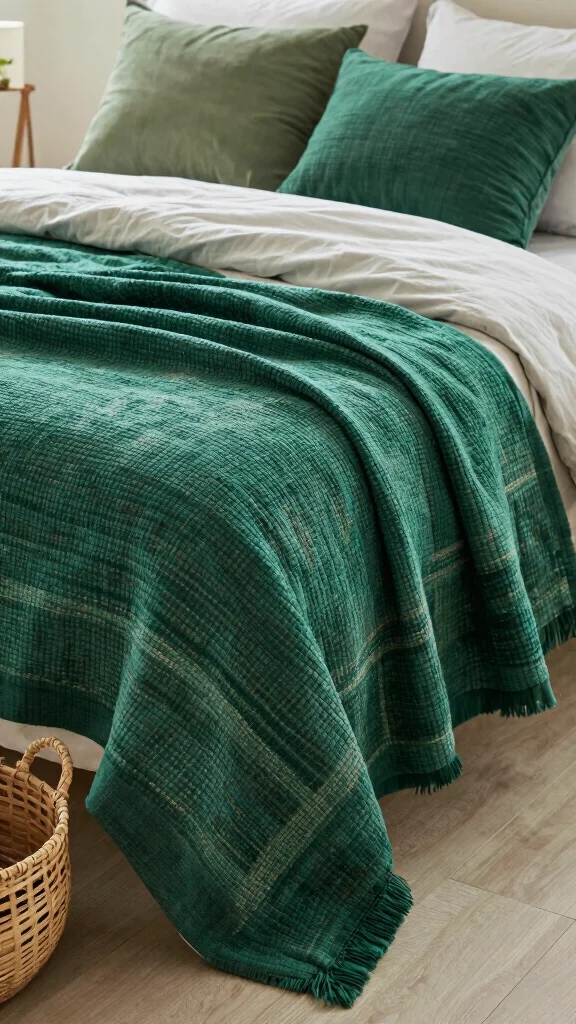 Simple textured throws in emerald green are the perfect finishing touch to your bedding setup. Whether knitted, crocheted, or woven, these throws add warmth and interest without overwhelming your decor. Choosing sustainable materials for your throws, such as organic cotton or recycled fibers, keeps your commitment to eco-friendly living intact. Imagine how a soft throw can enhance the inviting feel of your bed.