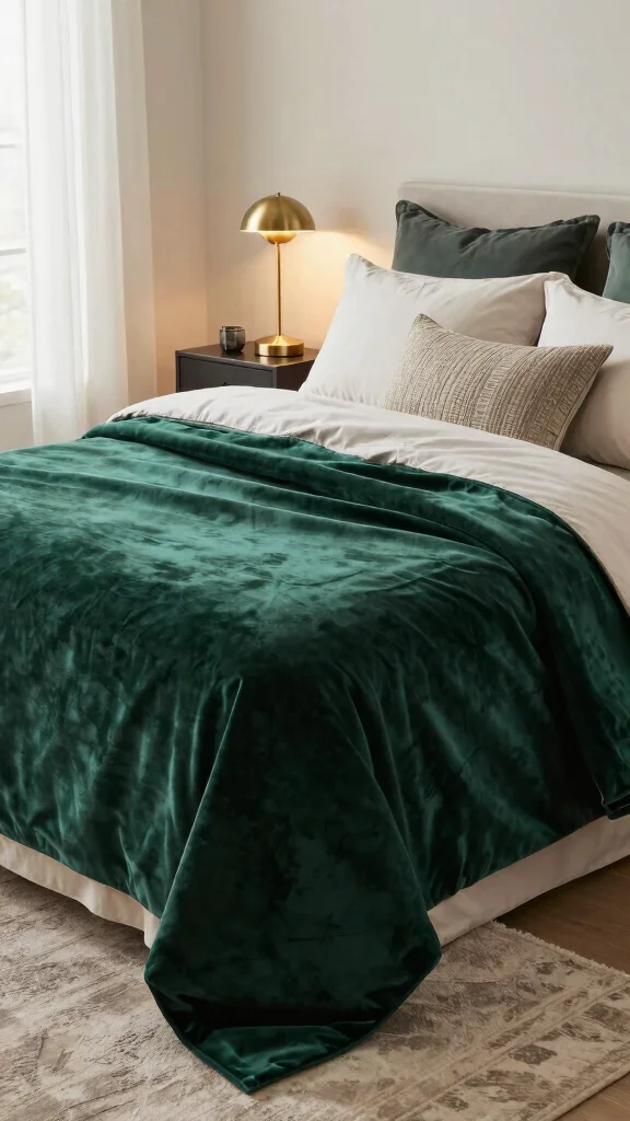 Embrace the richness of a velvet emerald green bedspread, creating a cozy and stylish sanctuary in your home.