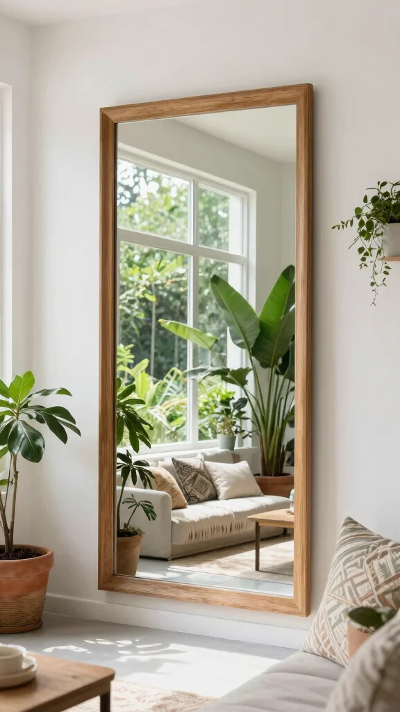 Brighten your sunroom with an oversized wall mirror that celebrates natural light and outdoor beauty. Vintage mirrors can bring an airy feel to the space, reflecting the lush greenery and creating an inviting atmosphere.