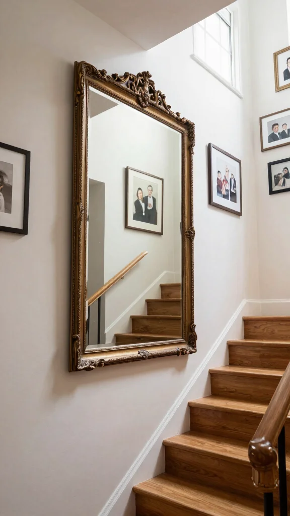 Turn your staircase into a stunning focal point with an oversized wall mirror. Vintage-inspired mirrors can enhance the area by creating character and an illusion of space, making your staircase a visual delight.