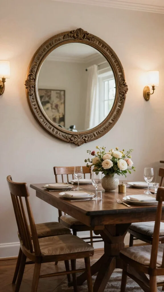 – Hang a round vintage mirror above the dining table for a chic centerpiece.