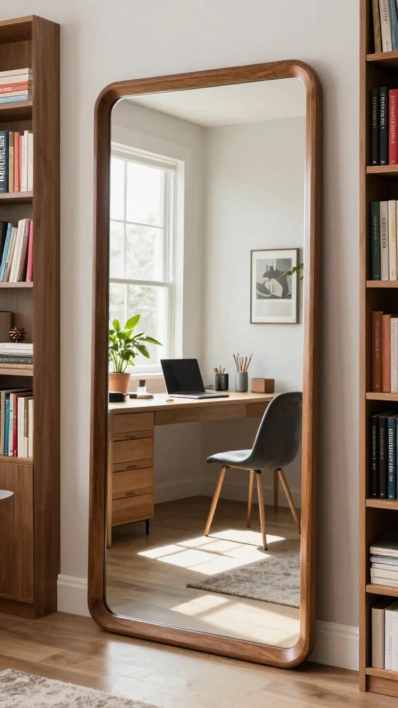 Enhance your home office with a large decorative mirror that not only beautifies the space but also boosts productivity. An oversized mirror can reflect light, making smaller offices feel more expansive while serving as a striking artistic statement.