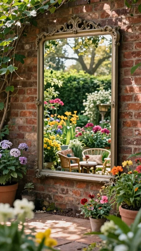 Don’t overlook your outdoor spaces! Incorporate oversized mirrors into your patio or garden setup to create a whimsical effect that visually expands the area. A vintage mirror adds an unexpected twist, complementing the lush greenery and outdoor decor.