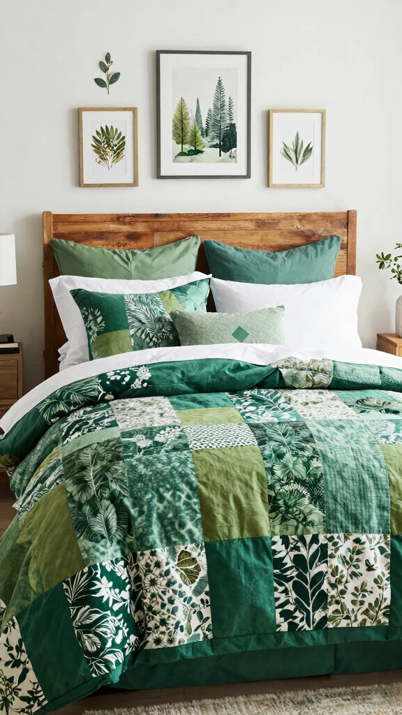 You can transform an existing green bedding set by refreshing the textures and accessories. Swap in a forest green duvet cover or add a forest green throw blanket and matching shams. Layer with new pillow varieties in different textures (knit, velvet, linen) and pull colors from the palette—creams, warm browns, and wood tones. Add a plant or two and tie in nature-inspired decor pieces like a jute rug or woven baskets. With small swaps, your old green bedding can feel brand-new under the banner of forest green bedding ideas.