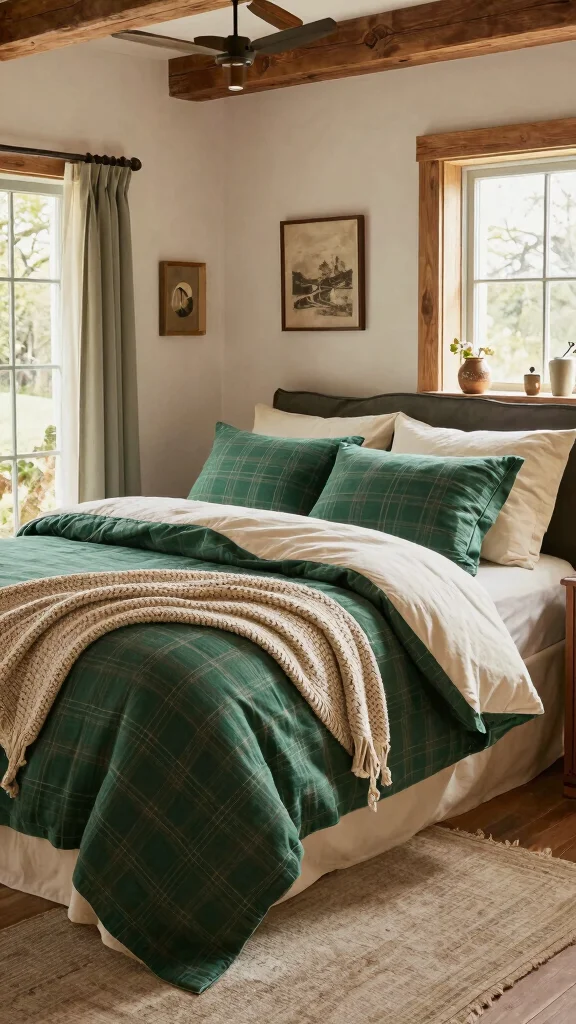 For charming rustic appeal, consider bedding that incorporates forest green with cozy, farmhouse elements. Patterns like plaid or check evoke warmth and comfort, perfect for creating a tranquil environment. This style blends beautifully with natural wood accents and vintage decor, enhancing your room’s inviting atmosphere.