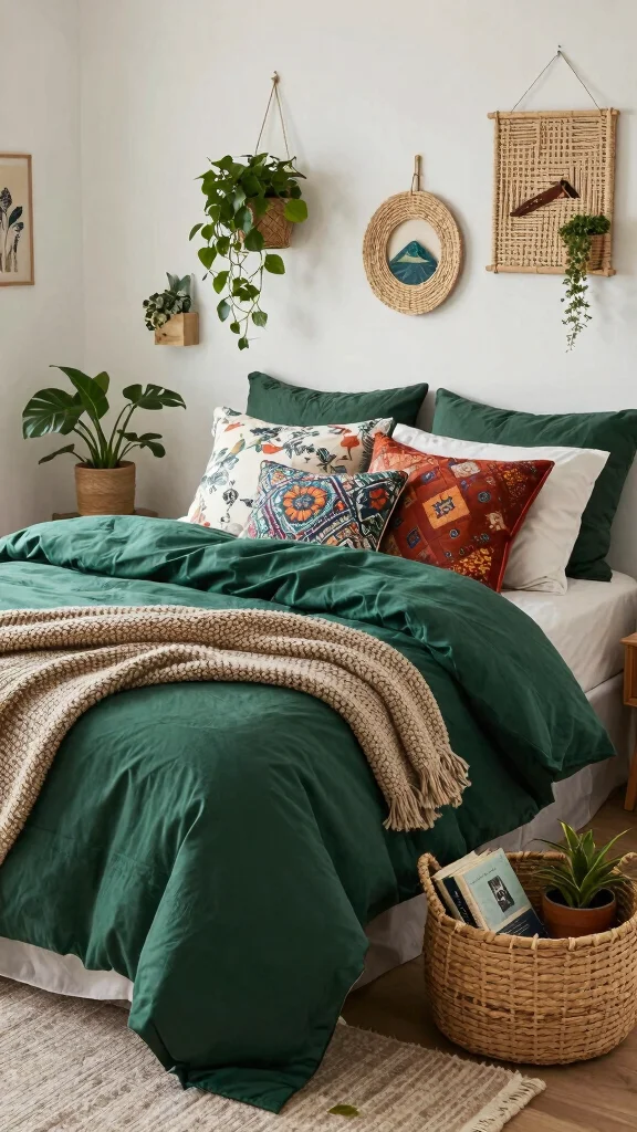 How can I style forest green bedding ideas to fit boho bedding styles?