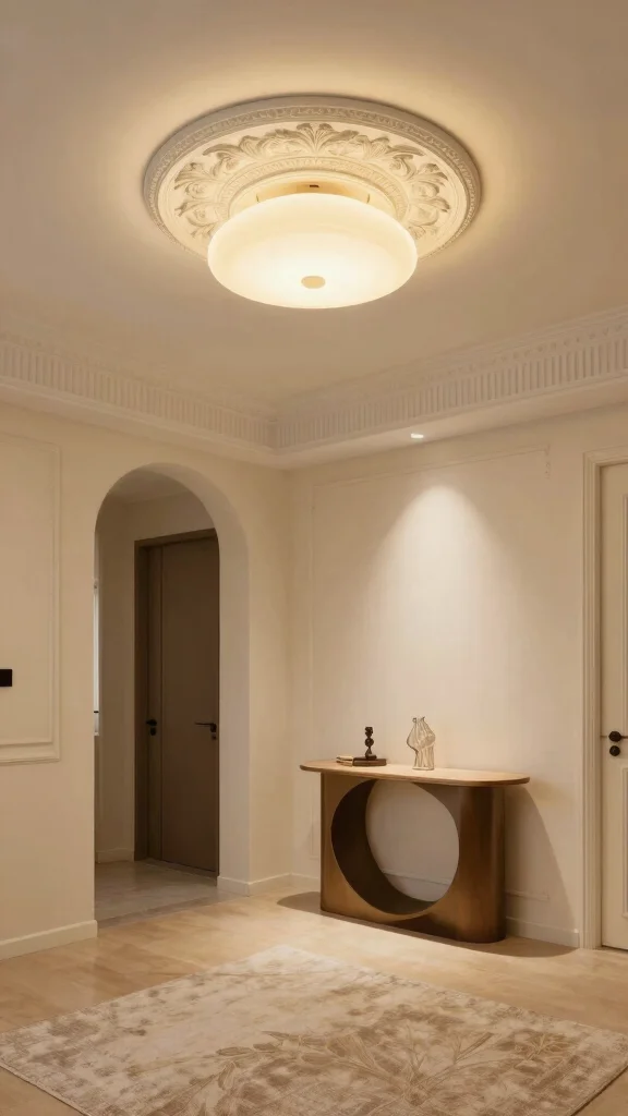 Adding decorative ceiling medallions can elevate your foyer lighting, especially when paired with low ceiling fixtures. These ornamental accents enhance any light fixture’s look and add visual intrigue to your ceiling. Medallions come in various sizes and styles, allowing you to customize them to suit your decor perfectly.