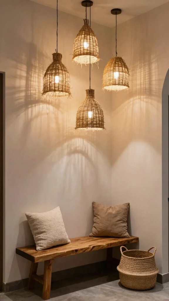 Hanging basket lights introduce a unique twist to traditional lighting options, often crafted from natural materials. These fixtures bring a touch of nature indoors, creating an airy and inviting feel in your entryway.