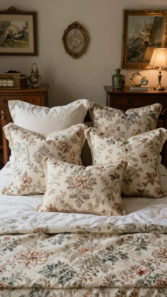 Utilizing a mix of floral, damask, or paisley prints evokes timeless charm. Layering different sizes and shapes enhances the vintage aesthetic, while a few faux fur pillows add comfort and coziness.