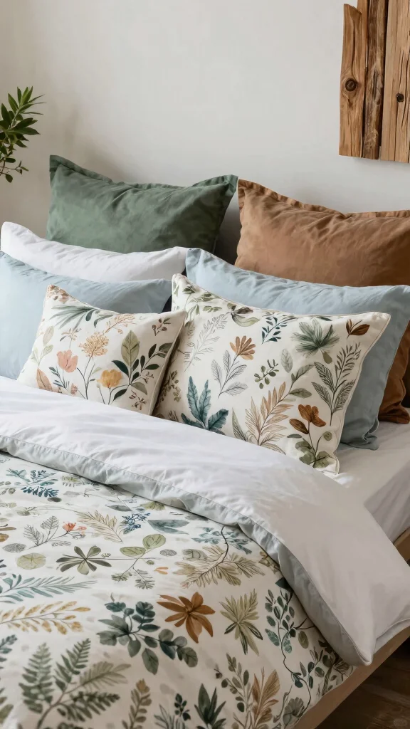Fun fact: A king bed throw pillows arrangement with earthy-toned pillows—larger solids at the back, smaller leaf-patterns in front—can make your master suite feel 20% more serene. Layer textures like cotton and linen to deepen that natural vibe and calm. Your room will whisper nature’s palette.