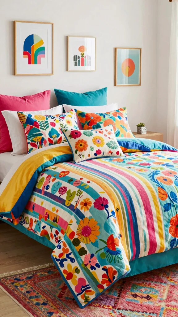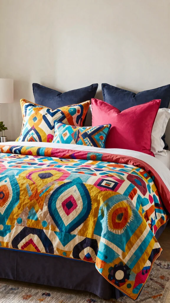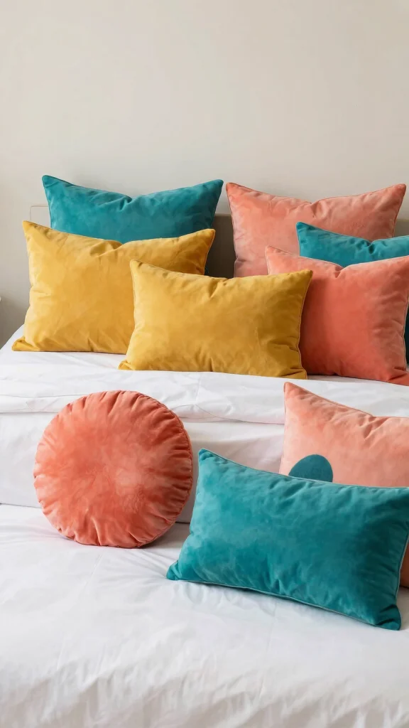 Incorporate various shapes—rectangular, square, and round—to keep the arrangement dynamic and engaging. This vibrant contrast can uplift your bedroom’s mood, making it feel cheerful and lively. Remember to include a few textured pillows to enhance depth.