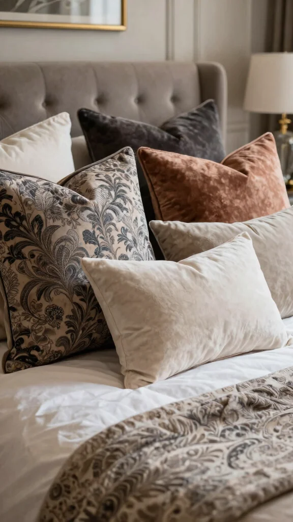 Create a luxurious pillow arrangement by combining various textiles for depth and richness. Begin with large pillows made from heavier fabrics like velvet or jacquard at the back. Introduce lighter textiles in the front, such as cotton or linen, to create a stunning visual contrast.