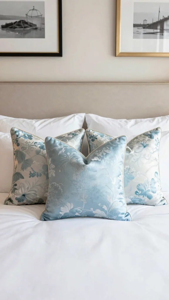 This arrangement is perfect for traditional bedrooms, exuding grace and sophistication. Adding metallics, such as gold or silver, can enhance the luxurious feel and elevate the overall aesthetic. Consider arranging your pillows with symmetry for a polished look.