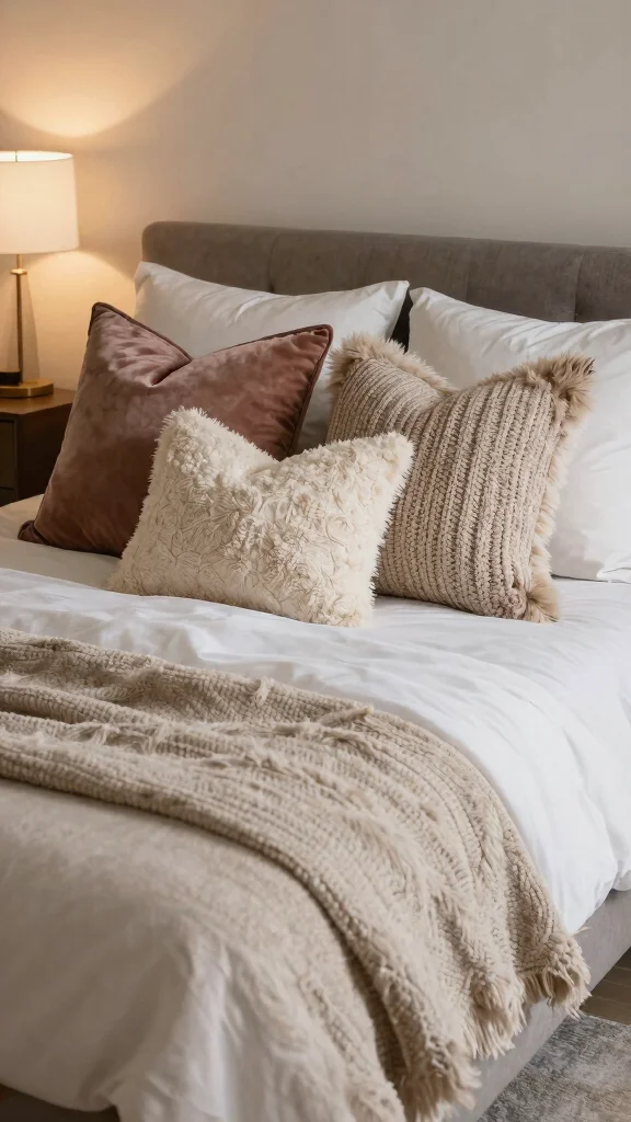 Texture is the magic ingredient that can elevate your pillow arrangement to new heights! Incorporate pillows made from an array of materials like linen, velvet, faux fur, and chunky knits for a rich visual experience. This method adds depth and invites touch, making your bed warm and inviting.