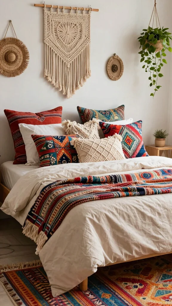 Infuse your bedroom with a free-spirited vibe using a bohemian-inspired throw pillow arrangement. Combine various patterns, textures, and colors that reflect your unique personality. Start with a base of large decorative pillows and layer smaller pillows featuring ethnic prints or macrame textures.