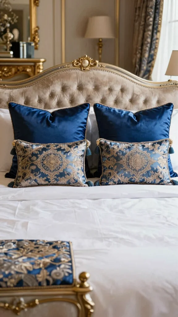 Embrace the timeless elegance of classic luxury with a refined pillow arrangement. Begin with two large, opulent pillows made from rich fabrics like silk or brocade, placed against the headboard. Follow this with smaller decorative pillows that showcase intricate details like tassels, embroidery, or decorative trims.