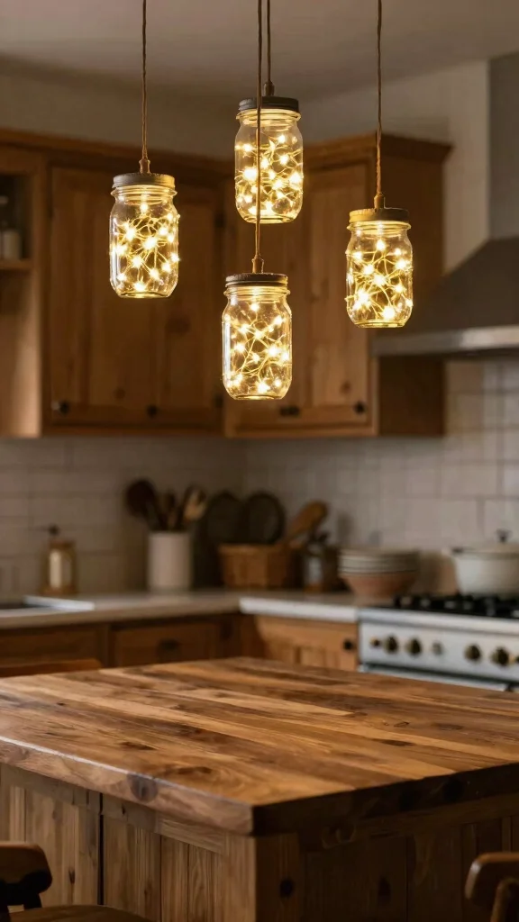 Mason jar lights add a whimsical, homemade touch to rustic kitchens, perfectly embodying the farmhouse aesthetic. Their charming design not only enhances the decor but also provides functional lighting. Consider hanging a cluster of mason jars filled with fairy lights or using them as sconces to create a soft, ambient glow that brightens your kitchen.