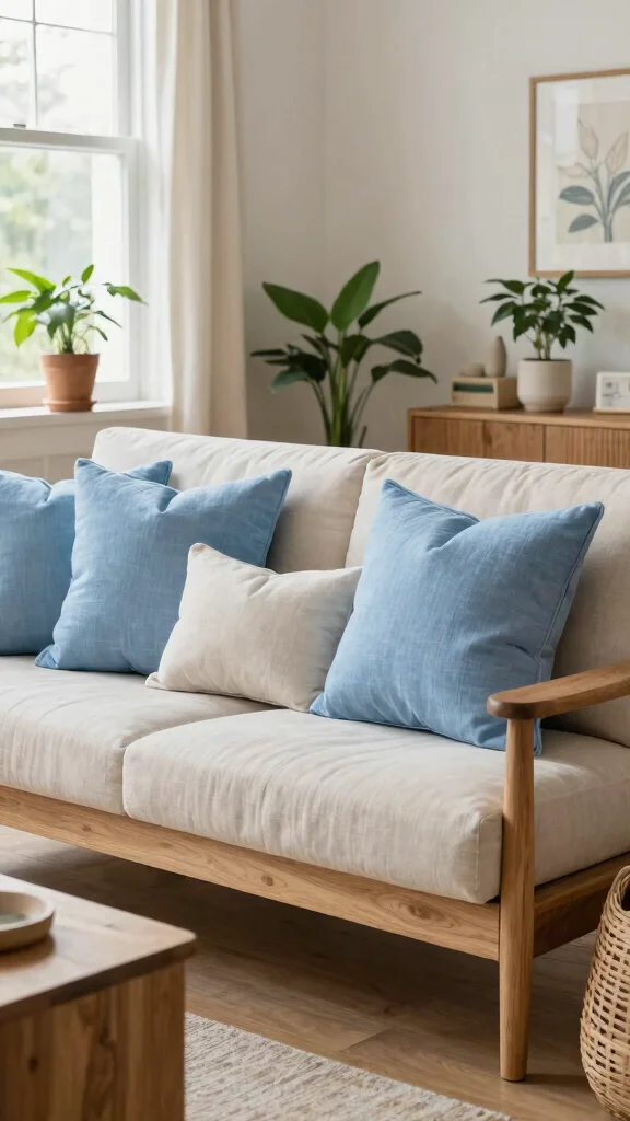 Think in layers and textures. Start with a sofa in white or cream, add 2-3 light blue throw pillows in different textures (linen, cotton, weave). Mix sizes: 18×18, 20×20, and a lumbar pillow for variation. Introduce blue accent pillows with a subtle pattern to keep the look lively. Place pillows in a gentle diagonal along the sofa and add a woven throw or driftwood-inspired accents to lean into the coastal vibe. Alternate with a couple of decorative cushions in solid blues or light patterns to maintain balance. Quick tip: rotate covers seasonally to refresh the room without buying new pieces.