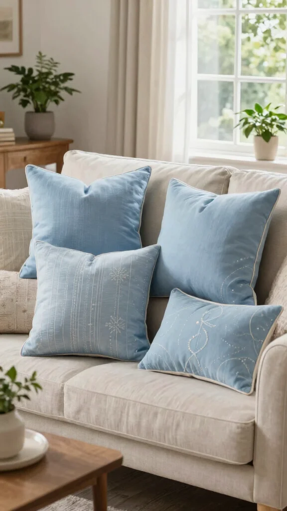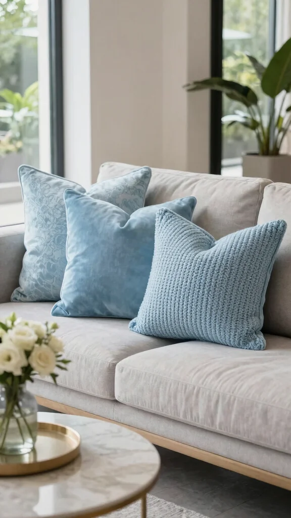 Light blue throw pillows can elevate your decor by introducing rich textures. Opt for luxurious velvet or cozy chunky knit pillows that invite comfort and warmth. These textures are perfect for creating a snug corner in your living space, especially when paired with smooth fabrics in various shades of blue, offering a delightful tactile experience.