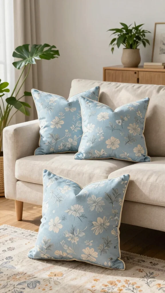 Floral patterns in soft blue hues can infuse your home with life and vibrancy. Light blue throw pillows adorned with delicate floral designs create a whimsical atmosphere, making your space feel warm and inviting. They can be beautifully mixed with solid colors, striking a lovely balance in your decor.