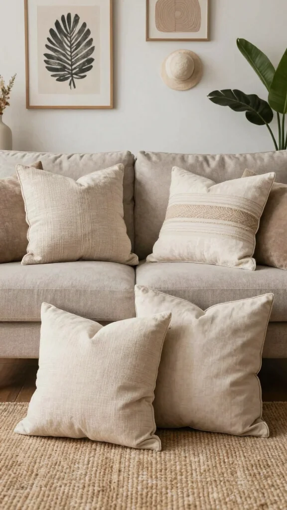 Start with a calm palette of warm beiges, creams, taupes, and soft charcoal to anchor the space. Choose 3-4 pillow sizes (18-20in squares, 12-16in accents, and a lumbar) and mix textures like linen, boucle, and cotton for soft textiles.
