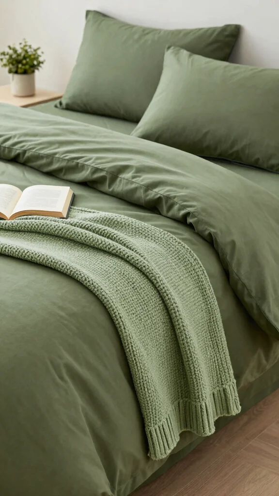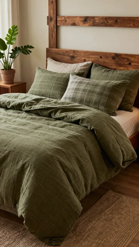 A great starting point for olive green bedding ideas is choosing sustainable materials like organic cotton or linen in olive tones. Pair a muted olive green duvet cover with ivory or warm gray sheets to keep the look calm. Add texture with a waffle-knit blanket and olive green throw pillows in ribbed or quilted fabrics. For eco-friendly choices, look for GOTS-certified fabrics and low-impact dyes, and finish with natural wood or rattan accents for authentic olive green bedroom decor.