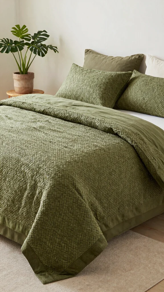 Handwoven bedding in olive green brings a unique touch that reflects artistry and craftsmanship. This bedding often features natural fibers, making it an eco-friendly choice that enhances your space with character. Pair it with solid colors to allow the intricate craftsmanship to shine.