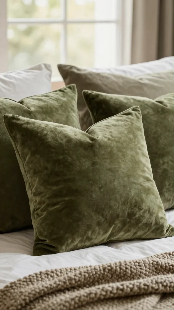 How can I use olive green throw pillows to boost depth and texture in the bedroom?