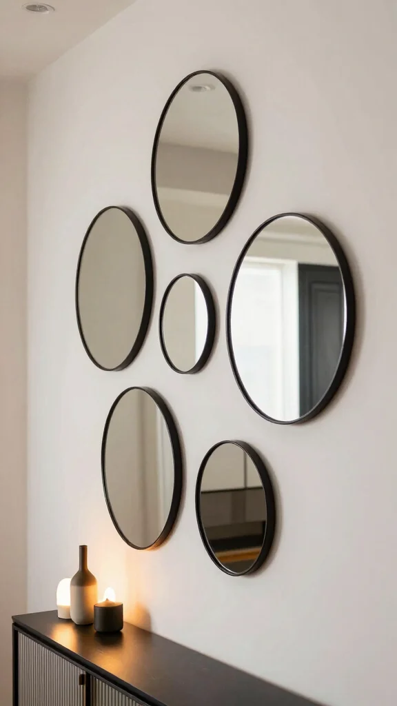 Layered round mirrors create striking focal points that elevate any room’s decor. By arranging various sizes of mirrors on a single wall, you can foster a sense of depth and intrigue. This design method is particularly effective in entryways or above console tables, where the reflective surfaces can beautifully catch and scatter light, enhancing the overall ambiance.