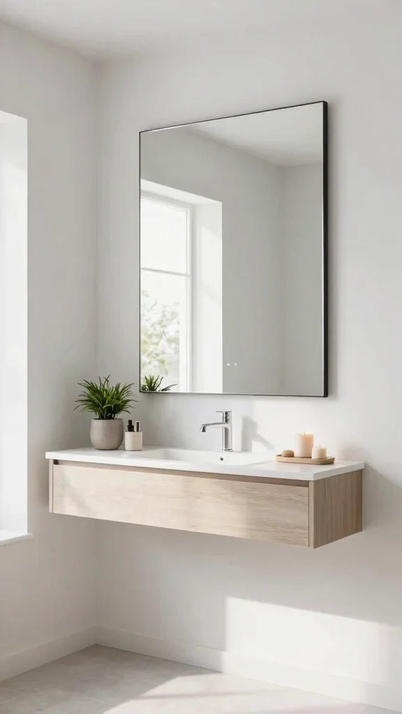 Consider these implementation tips: Place your mirror near overhead lighting to maximize brightness and use a longer design to span a small wall, elevating it to a focal point without clutter. Pair with neutral shades like whites or soft grays to enhance the minimalist aesthetic.