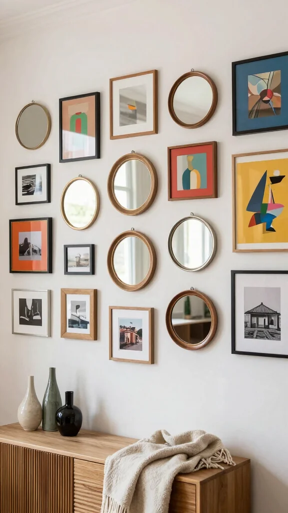 This setup not only showcases your personality but also maintains a unified look. Keep the mirrors small to ensure they complement rather than overshadow your artwork.